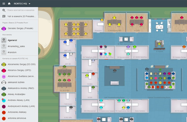 Вы видите всех сотрудников, расположение их аватаров, имена, и кто с кем общается. Стройте свои взаимодействия с учётом их состояния и занятости. Есть удобная функция поиска сотрудника по имени.